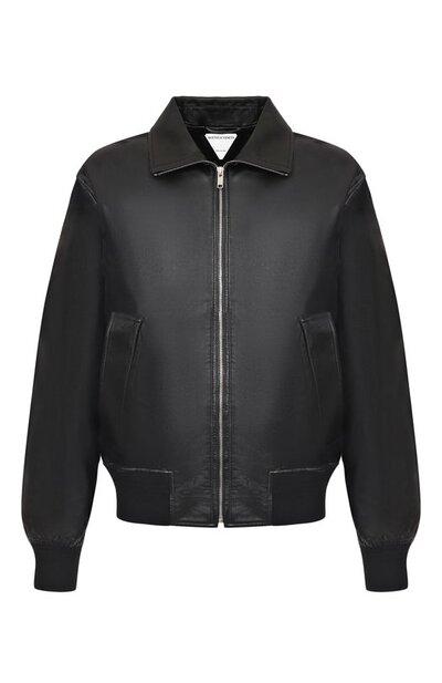 Бомбер с геометричной кокеткой выполнили из кожи ягненка, а для подклада выбрали шелковистую вискозу в тон. По бокам предусмотрели врезные карманы с широкими листочками. Куртка с трикотажными манжетами и поясом застегивается наглухо контрастной молнией.