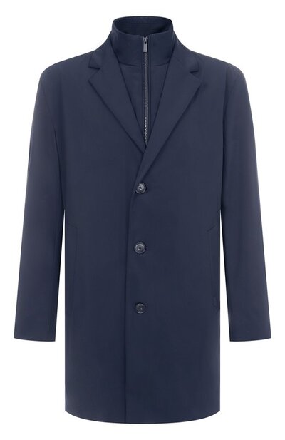 Однобортный плащ с прямоугольными лацканами и боковыми карманами сшили из эластичного нейлона. Еще два кармана предусмотрели на съемном внутреннем жилете с фирменной нашивкой в тон спереди.