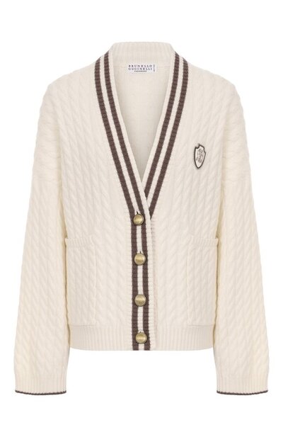 Кашемировый кардиган с арановым узором украсили контрастными полосами на отделке в рубчик и геральдической нашивкой с эмблемой Solomeo спереди. Модель с боковыми карманами застегивается фирменными металлическими пуговицами.