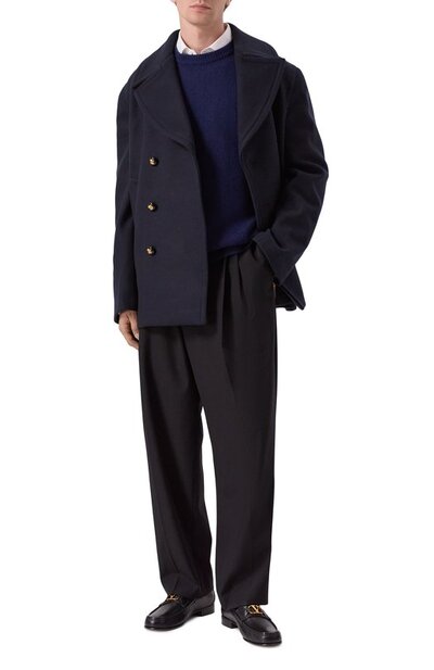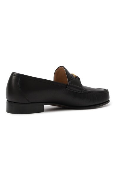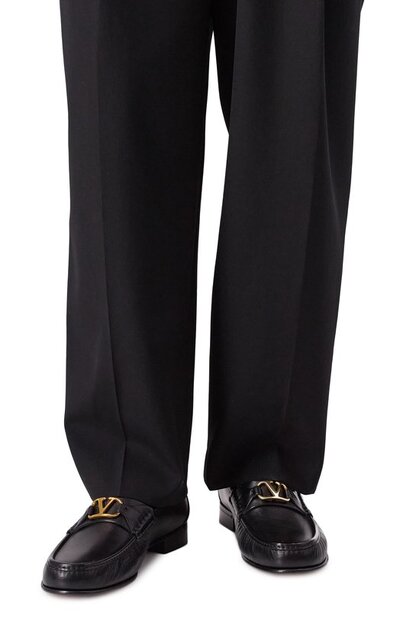 Лоферы с рельефным швом вдоль мыса изготовили из кожи буйвола. Модель на квадратном наборном каблуке украсили перемычкой с золотистой пряжкой VLogo.