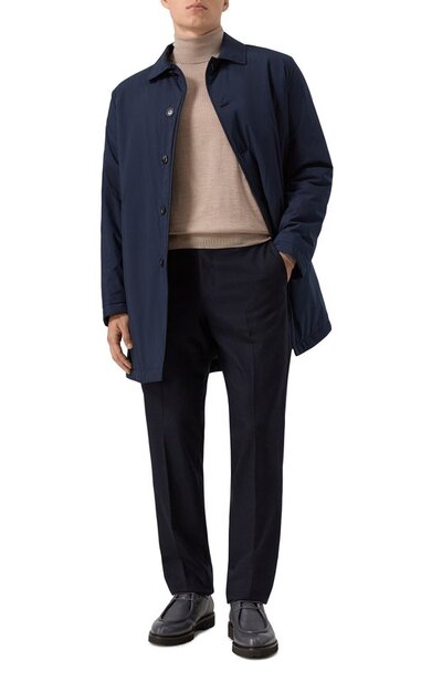Для пошива однобортного плаща с отложным воротником использовали гладкий матовый полиэстер. Прямую модель на пуговицах дополнили парой втачных карманов по бокам.