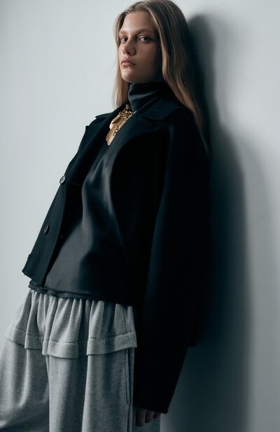 Топ с открытой спиной выполнили из стрейчевого атласа на основе вискозы и шелка. Высокий воротник-халтер у изделия застегивается пуговицами сзади. В комплекте — шарф в тон с бахромой по краям.