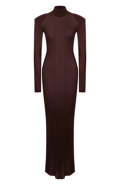 Облегающее макси-платье с высоким воротником-стойкой сшито из вискозного трикотажа в рубчик. Однотонная модель без декора дополнена съемными подплечниками.