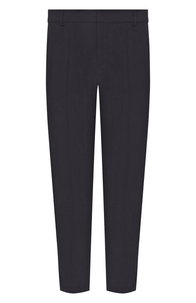 Слегка зауженные брюки из шерстяного твила дополнили лампасами из атласа в тон. Такой же тканью подчеркнули задние карманы на пуговицах, а боковые оставили без отделки.