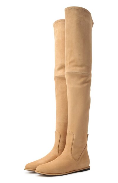 Ботфорты на тонкой подошве и низком каблуке выполнили из замши, отделав внутри кожей. Модель с эластичным голенищем без застежки дополнили петлей сзади.