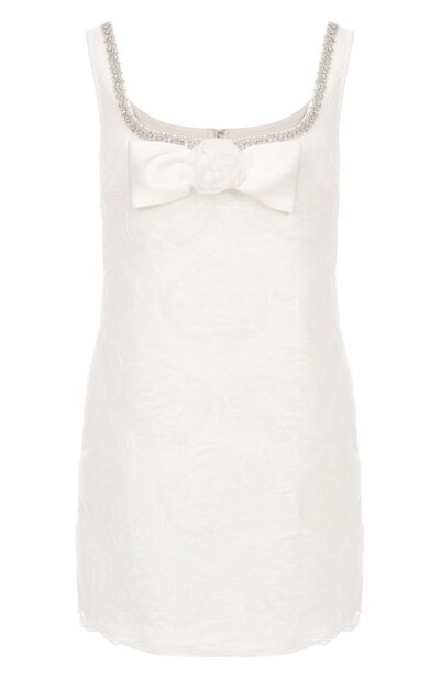 Мини-платье сшили из кружева с цветочным мотивом. Вырез подчеркнули кристаллами и крупным бантом. Модель с подкладом застегивается потайной молнией сзади.