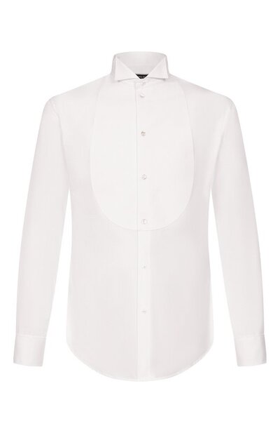 Приталенную сорочку на перламутровых пуговицах выполнили из хлопкового поплина. Модель с фигурным пластроном, воротником-бабочкой и манжетами под запонки вошла в коллекцию Icon.