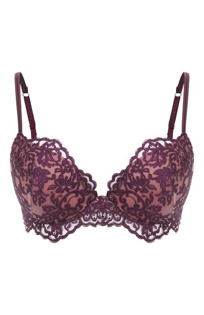 Бюстгальтер с чашечками пуш-ап на косточках вошел в коллекцию Royal Jewel. Модель с регулируемыми брендированным бретелями и фестончатым поясом выполнили из полупрозрачного кружева с цветочным узором, вышитым по тюлю.