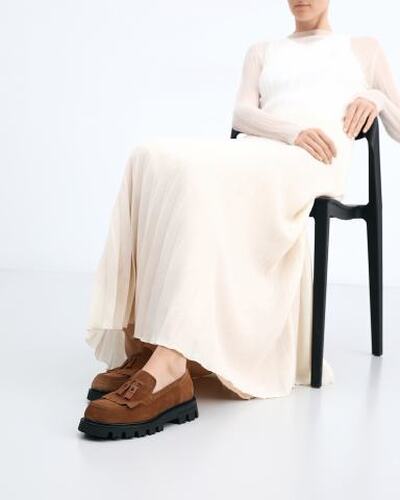 Лоферы Fratelli Rossetti One выполнены из мягкой замши. Благодаря подкладке и стельке из натуральной кожи пара устойчива к износу и хорошо держит форму, что обеспечивает абсолютный комфорт. Носочная часть очерчена фактурным швом, а также украшена бахромой и кисточками из кожи. Объемная контрастная подошва изготовлена из прочной резины.