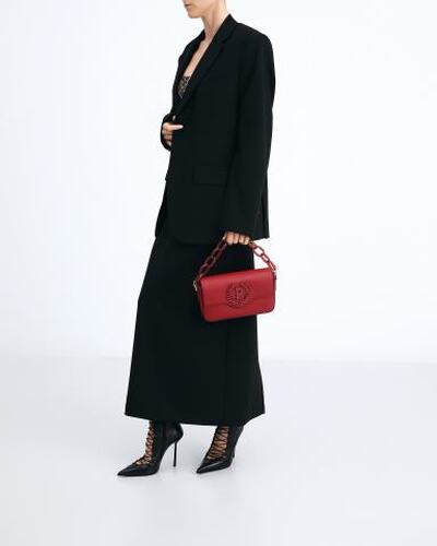 Сумка Pollini выполнена из экокожи и украшена фирменным логотипом. У модели короткая ручка-цепь и съемный ремень на карабинах, чтобы ее можно было носить любым удобным способом. Аксессуар закрывается на магнитные кнопки. Внутри — текстильная подкладка и карман на молнии.