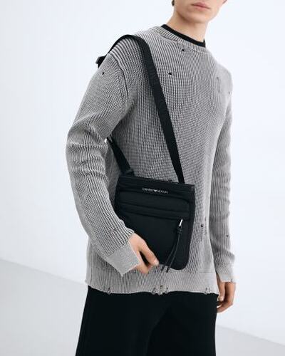 Сумка Emporio Armani выполнена из плотного влагостойкого текстиля с принтом в виде логотипа бренда. Длинный ремешок позволяет носить изделие на плече или через плечо. Спереди — закрывающийся карман. Модель застегивается на молнию. Внутри — текстильная подкладка и дополнительный карман. Аксессуар украшен фирменной эмблемой.