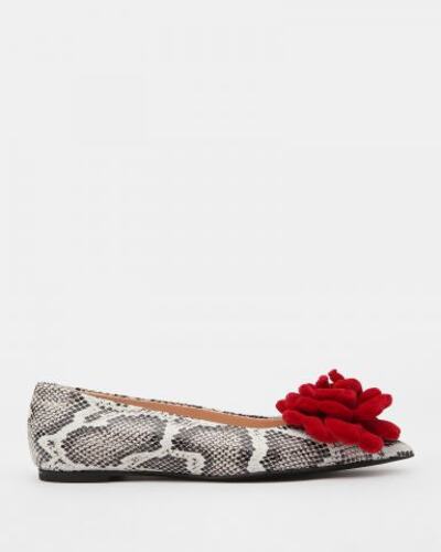 Балетки AGL выполнены из натуральной кожи со змеиным принтом. Заостренная носочная часть украшена массивным контрастным цветком. Материал подкладки, стельки и подошвы — натуральная кожа, обеспечивающая воздухопроницаемость и абсолютный комфорт в течение всего дня.