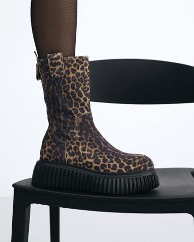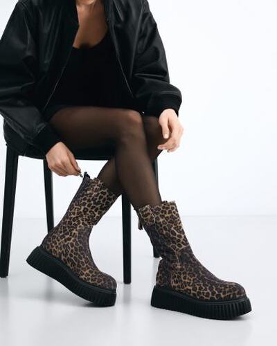Ботинки AGL выполнены из натуральной ворсовой кожи с леопардовым принтом. Объемная рельефная подошва из резины создает аутентичный силуэт и защищает обувь от износа. Подкладка из шерсти и стелька из натурального меха сохраняют тепло и обеспечивают максимальный комфорт на протяжении всего дня. Для удобства пара дополнена молнией на заднике. Изделие украшено логотипом бренда и декоративными петлями.