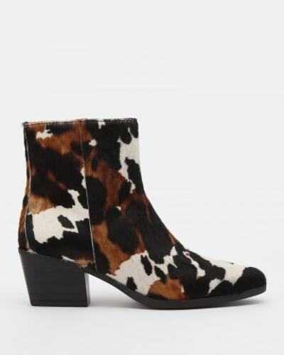 Ботинки Principe di Bologna выполнены из ворсовой кожи с коровьим принтом. Подошва из резины и широкий каблук максимально устойчивы. Внутренняя подкладка и стелька из натуральной кожи адаптируются к форме стопы и обеспечивают воздухопроницаемость. Для удобства пара дополнена застежкой на молнию по внутренней поверхности.