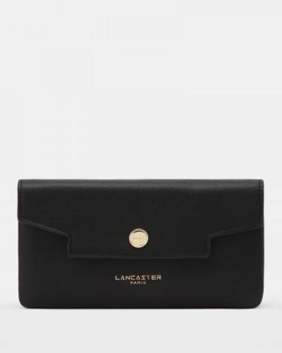 Портмоне Lancaster выполнено из зернистой воловьей кожи. Аксессуар застегивается на клапан с кнопкой. Внутри — отделение для банкнот, слоты для карт и карман для монет на молнии. Изделие украшено фирменным логотипом бренда. В комплекте — плечевой ремень-цепочка из золотистого металла.