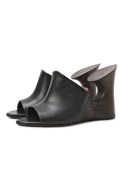 Мюли La Sculpture с миндалевидным мысом выполнили из гладкой кожи. Пару установили на фигурную деревянную танкетку с логотипом.