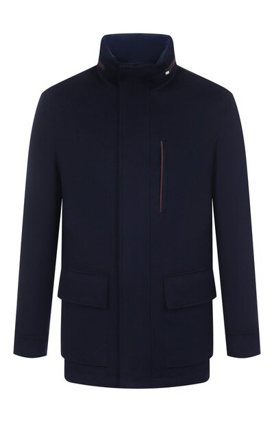 Куртку со съемным регулируемым капюшоном сшили из влагоотталкивающего кашемира Carcoat, произведенного по технологии Storm System® на мануфактуре Loro Piana. Модель с утеплителем Primaloft дополнили внутренним и тремя внешними карманами. Воротник-стойку украсили серебристой эмблемой сзади.