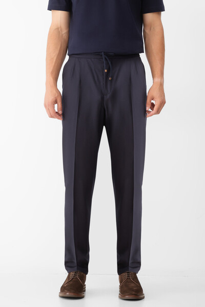 Зауженные брюки BRUNELLO CUCINELLI с широким эластичным поясом-кулиской. Для производства модели тёмно-синего цвета выбрана мягкая шерстяная фланель. Изделие с классическими стрелками и двойными защипами спереди органично впишется в нестрогий офисный образ, и в комплект для городских улиц.