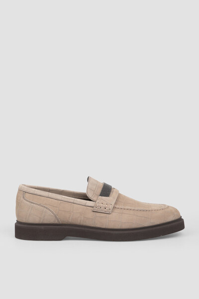 Пенни-лоферы Brunello Cucinelli с тиснением под кожу крокодила. Модель изготовлена из мелковорсистого нубука с мужским характером. В верхней части союзки классическая перемычка с прорезью декорирована тонкими нитями из рядов блестящей цепочки Мониль, завершающими дизайн пары нотой в фирменном стиле. Изделие с традиционным для такого типа обуви рельефным швом установлено на гибкую подошву из очень лёгкого материала ЭВА с устойчивым каблуком и рифлением в нижней части.
