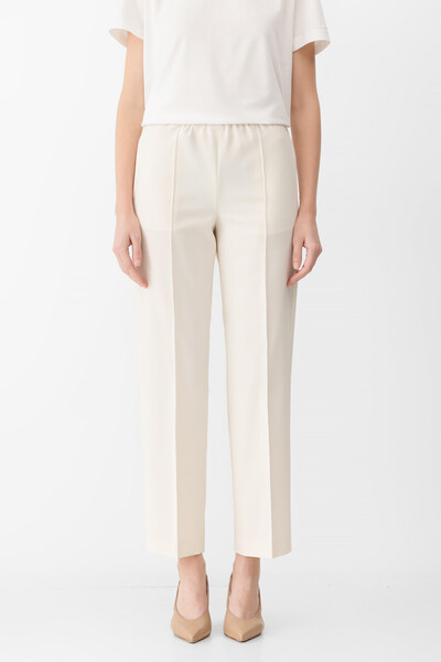 Белые брюки Gubbio в спортивном стиле от Fabiana Filippi. Изделие прямого силуэта выполнено из эластичного трикотажа на основе прочного полиэфира и экологичного вискозного волокна. Линию талии подчёркивает широкий эластичный пояс-резинка, а силуэт - очерченные стрелки.