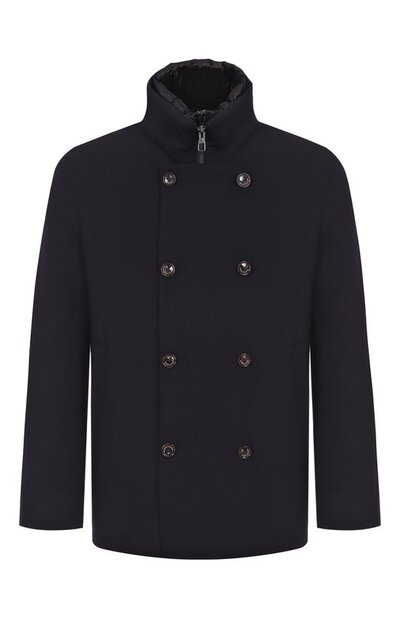 Двубортную куртку со стеганым нейлоновым подкладом на утином пуху выполнили из стрейчевого полиэстера. Модель с серебристой эмблемой на воротнике-стойке сзади дополнили съемным нагрудником, боковыми и внутренним карманами с молниями.
