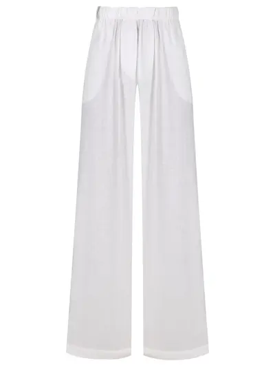 -Белые брюки из вискозы и льна от HINNOMINATE. -Модель свободного кроя с эластичным поясом для выбора комфортной высоты посадки и прорезными карманами по бокам. -Брюки составят идеальную пару с рубашкой из того же материала.