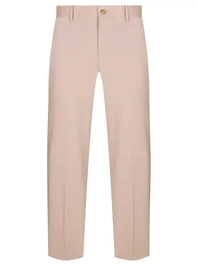 -Бежевые брюки купажированного состава от L.B.M.1911 -Модель прямого кроя со стандартной посадкой, поясом со шлевками, прорезными карманами, застежкой на молнию и пуговицу, графичными стрелками, которые визуально вытягивают силуэт.