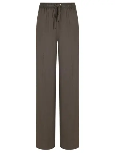 -Зеленые легкие брюки купажированного состава от LORENA ANTONIAZZI. -Модель прямого кроя с высокой посадкой, эластичным поясом на кулиске, прорезными карманами.