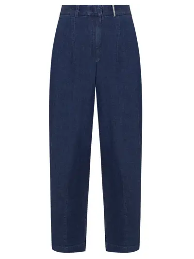 -Синие укороченные джинсы из хлопка от PANICALE. -Модель прямого кроя длины 7/8 со стандартной посадкой, поясом со шлевками, прорезными карманами, застежкой на молнию, декором цепочками Мониль.