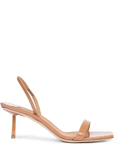 -Бежевые лакированные босоножки из натуральной кожи от LE SILLA. -Модель с квадратным мысом, узкой союзкой, ремешками с эластичными вставками вокруг щиколоток, каблуком-шпилькой комфортной высоты.