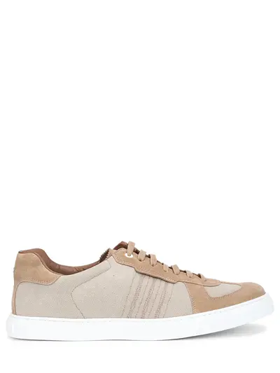 -Бежевые кеды из текстиля и натуральной замши от FRATELLI ROSSETTI. -Модель с закругленным мысом, толстой резиновой подошвой, функциональной шнуровкой, логотипами бренда на боковых панелях и задниках, внутренней отделкой из натуральной кожи.