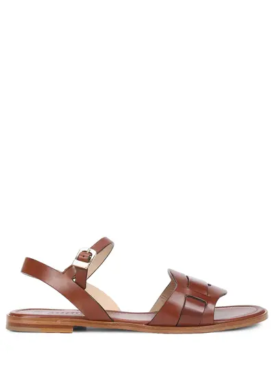 -Коричневые сандалии из натуральной кожи от FRATELLI ROSSETTI. -Модель с закругленным мысом, широкой союзкой, ремешками с пряжками вокруг щиколоток, низким каблуком, гибкой подошвой.