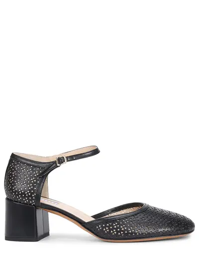 -Черные туфли из натуральной кожи с перфорацией от FRATELLI ROSSETTI. -Модель с округлым мысом, закрытой пяткой, ремешками с пряжками вокруг щиколоток, толстым устойчивым каблуком комфортной высоты, внутренней отделкой из натуральной кожи.