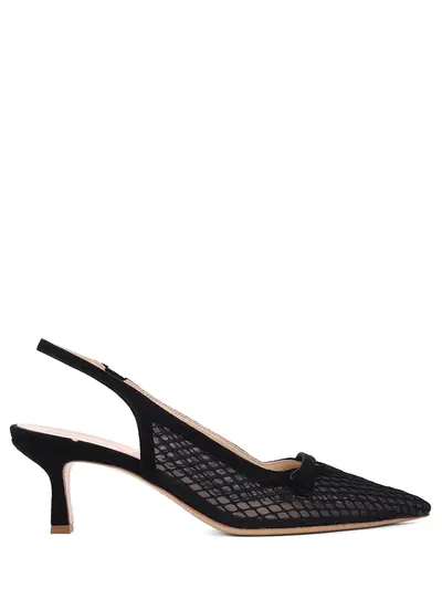 -Черные туфли из замши и текстильной сетки от FABIO RUSCONI. -Модель с зауженным мысом, ремешками с эластичными вставками вокруг щиколоток, низким каблуком-шпилькой, стелькой из натуральной кожи.