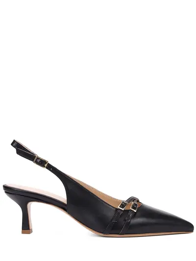 -Черные туфли из натуральной кожи от FABIO RUSCONI. -Модель с зауженным мысом, открытой пяткой, ремешками с пряжками вокруг щиколоток, устойчивым каблуком комфортной высоты, внутренней отделкой из натуральной кожи.