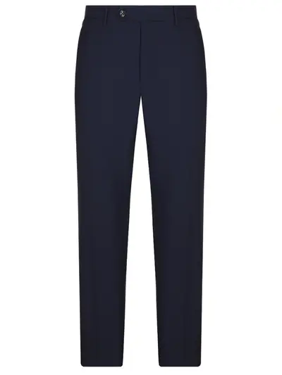 -Синие брюки из тонкой смесовой шерсти от BERWICH. -Модель прямого кроя со стандартной посадкой, поясом со шлевками, прорезными карманами, застежкой на молнию и пуговицу.