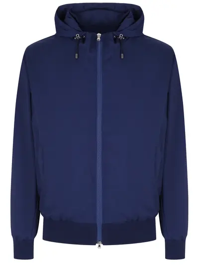-Синий бомбер из легкой плащевой ткани от BARBA. -Модель с кроем по фигуре, длинными рукавами, трикотаж манжетами и поясом, капюшоном на кулиске, прорезными карманами, застежкой на молнию с двумя пуллерами.