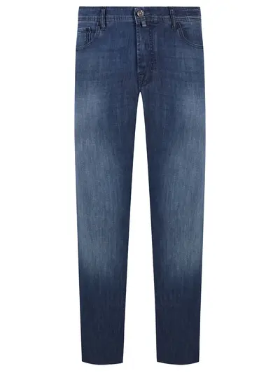 -Синие джинсы Bard из смесового хлопка от JACOB COHEN. -Модель зауженного к низу кроя со стандартной посадкой, поясом со шлевками, прорезными и накладными карманами, застежкой на пуговицы, нашивкой с логотипом бренда сзади.