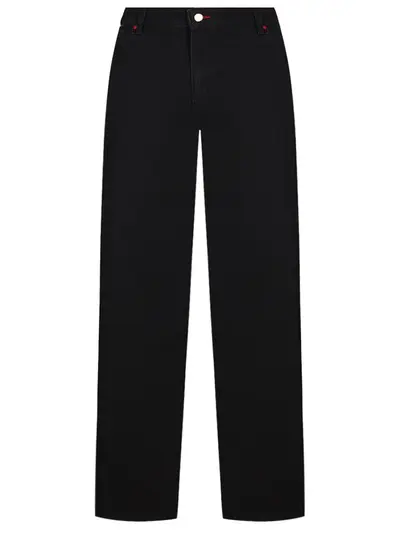-Модель прямого кроя с высокой посадкой, поясом со шлевками, прорезными и накладными карманами, застежкой на молнию и пуговицу, нашивкой с логотипом бренда сзади, крупной вышивкой на заднем кармане.
