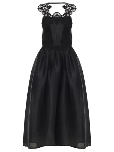 -Модель приталенного кроя с широкими бретелями, расклешенной асимметричной юбкой и отделкой изящным кружевом.