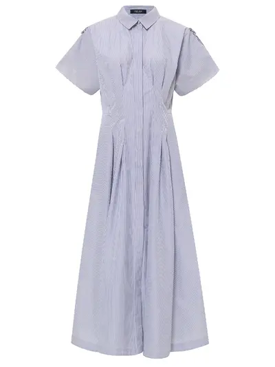 -Голубое в полоску платье-макси из хлопка от FREE AGE. -Модель приталенного кроя с короткими рукавами, отложным воротником, расклешенной юбкой, супатной застежкой на пуговицы.