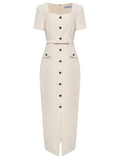 -Модель с акцентом кроя на талии и бедрах, короткими рукавами, клапанами на бедрах, вырезом-каре на груди, застежкой на потайную молнию сзади, которая не отвлекает от чистоты линий кроя.