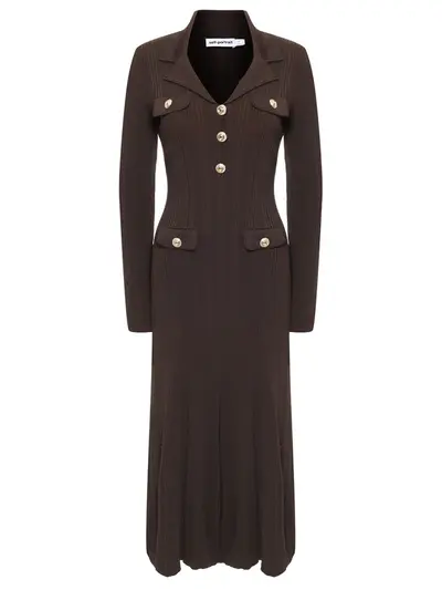 -Платье-миди из вискозного трикотажа шоколадного цвета от SELF-PORTRAIT. -Модель с акцентом на талии и бедрах, длинными рукавами, глубоким V-образным вырезом декольте, отложным воротником, юбкой А-силуэта, крупными золотистыми пуговицами в декоре.