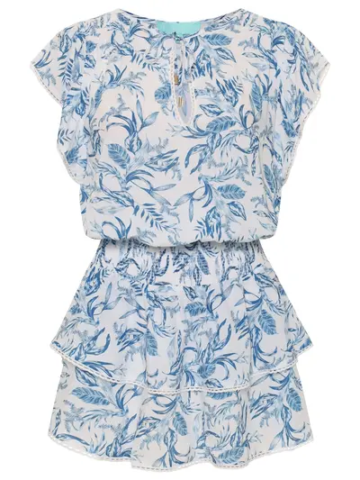 -Туника из вискозы с принтом в голубых тонах от MELISSA ODABASH. -Модель с широким эластичным поясом, короткими цельнокроенными рукавами, окргулой горловиной, глубоким вырезом на груди на завязках, ярусным кроем юбки.