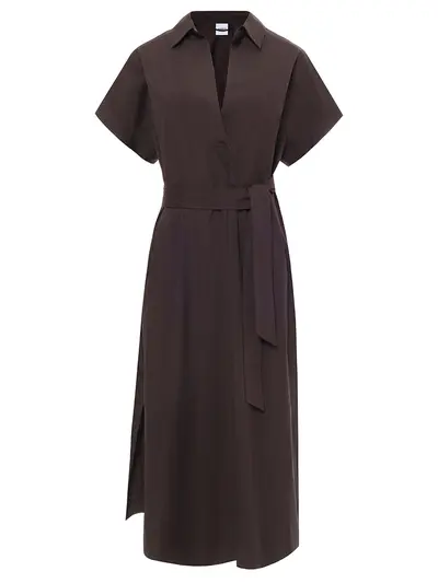-Широкий акцентный пояс в тон подчеркивает талию и структурирует силуэт.