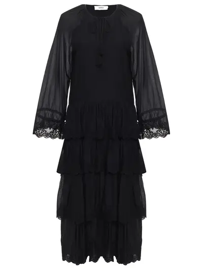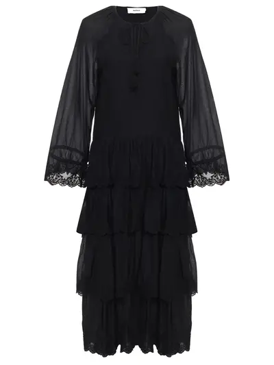 -Модель свободного кроя с длинными рукавами-реглан, круглым вырезом горловины с завязками на груди, широкими оборками на подоле.