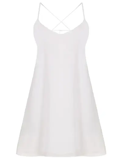 -Белое платье из легкого дышащего рами от FISICO. -Модель свободного кроя на узких бретелях, перекрестных на спине, с глубоким V-образным вырезом декольте.