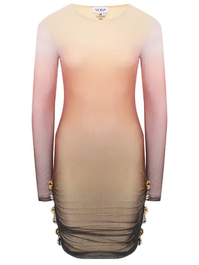 -Мини-платье купажированного состава с принтом от MOEVA. -Модель с кроем по фигуре, длинными рукавами, круглым вырезом горловины, драпировками ткани на подоле, крупной акцентной металлофурнитурой.