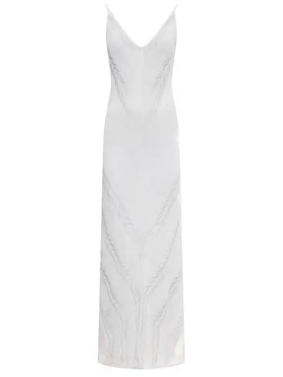 -Белая туника из вязаного вискозного трикотажа от MOEVA. -Модель с акцентом на талии и бедрах, узкими бретелями на плечах, глубоким декольте и разрезами по боковым швам.