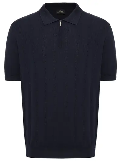 -Темно-синее трикотажное поло из пряжи купажированного состава от CASTANGIA. -Модель полуприлегающего силуэта с короткими рукавами, рельефными манжетами и поясом, отложным воротником, застежкой на молнию.